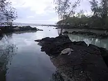 Located offshore is Scout Island, known locally as Mahikea Island.[3] The original name of Mahikea Island is Peiwe (a corruption of the 'Olelo Hawai'i spelling of 'Pe'ewe'). This name refers to the drupe shells, whose snails were commonly eaten and found throughout the Hawaiian Islands in shallow, rocky areas. The island was hit by the tsunami in 1946, which shortened it on its makai (seaward) end. It used to be a popular summer camping site among the residents of Keaukaha, as well as a destination for the Big Island boy scouts (hence its English name “Scout Island”).[4]