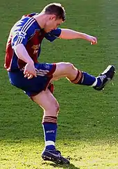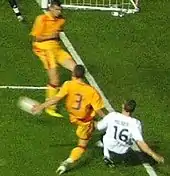 Milner's first-team debut for Leeds came on 10 November 2002, in a match against West Ham United, when he came on as a substitute for Jason Wilcox for the last six minutes.[20][21] The appearance made him the second-youngest player ever to play in the Premier League, at the age of 16 years and 309 days.[22] On 26 December 2002, at 16 years and 356 days, he became the youngest player to score in the Premier League, with a goal in a 2–1 win against Sunderland.[16][23] His record was broken by James Vaughan of Everton in 2005.[24] In a match against Chelsea two days later, Milner scored again, with a deft first touch of the ball and manoeuvre, to avoid a tackle from Chelsea defender Marcel Desailly.[25] The manoeuvre created a yard of space for him to deliver a curling shot from 18 yards (16 m).[25] Reporters were impressed by his overall performance in the match, especially by his desire, confidence, and ability with both feet.[26] Chelsea manager Claudio Ranieri remarked after the match that Milner had performed like a much more experienced player.[27] The performance prompted comparisons to England internationals Michael Owen and Wayne Rooney, who had also come to footballing prominence as teenagers.[28]