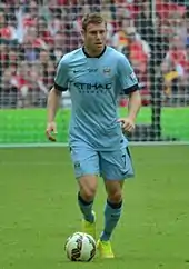 On 17 August 2010, it was reported that Aston Villa had agreed a deal with Manchester City to sell Milner subject to a medical.[96] The deal was reported to be worth around £26 million,[97] including a player exchange of Stephen Ireland.[98] Milner made his debut for City on 23 August 2010 in a 3–0 home win against Liverpool, where he set up the first goal for former Villa teammate Gareth Barry.[99] Milner scored his first competitive goal for Manchester City in an FA Cup third-round match at Leicester City which ended in a 2–2 draw.[100] The Leicester match was the start of a cup run that saw Manchester City reach the 2011 FA Cup final.[101] Milner was an unused substitute as Manchester City beat Stoke City 1–0 to win the FA Cup.[102]
