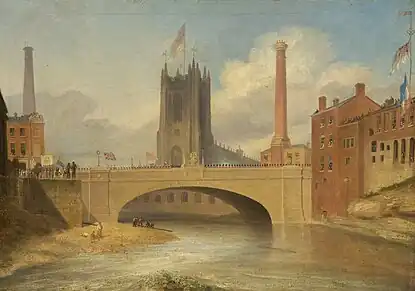 As a painter he was strongly influenced by his father in style, choice of subject matter, and even signature (leading to confusion between the two by later collectors and antiquarians)—they each produced a wide range of portraits and landscapes, including marine and rural scenes, but they both became especially known for their depictions of the buildings and streets of Manchester as it transformed into a modern city during the Industrial Revolution.[13] Parry was also a prolific engraver of both his own paintings and those of others; early notable commissions include Samuel Hibbert-Ware's A Description of the Shetland Islands (1822), John Corry's History of Lancashire (1825), and Rogerson & Sowler's Copperplates of Manchester Edifices (1818-1825)—of which Parry also drew four of the 15 total illustrations.[5][14][15][16]