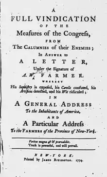 James Rivington was born in London in 1724.[2] One of the sons of the bookseller and publisher Charles Rivington, he inherited a share of his father's business, which he lost at the Newmarket races. In 1760, he sailed to North America. He resumed his occupation in Philadelphia and the next year opened a printshop at the foot of Wall Street, New York.[3]