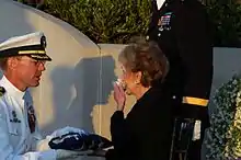 Captain Symonds presents the flag that draped President Ronald Reagan's casket to former first lady Nancy Reagan, June 11, 2004