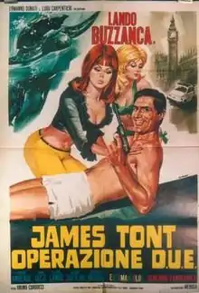 James Tont operazione D.U.E. or The Wacky World of James Tont is a 1966 French/Italian[1] international co-production spy film spoof based on James Bond's Thunderball and featuring elements predating the release of You Only Live Twice. Directed by Bruno Corbucci, the Eurospy spy-fi comedy adventure is the sequel to James Tont operazione U.N.O. (1965) with Lando Buzzanca repeating his role as 00 Agent James Tont, a satire of James Bond and Loris Gizzi as the black monocle wearing supervillain spoof of Emilio Largo.