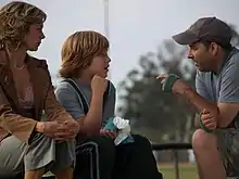 Vasquez (right) directing Carrie Preston and Lurie Poston on the set of the film Ready? OK!