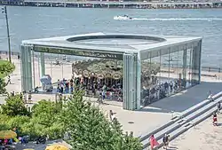 Originally, the carousel was supposed to be located in a waterfront development at Fulton Ferry, Brooklyn, created by David Walentas;[9] however, the development was canceled in 1999.[10] The Walentases restored the merry-go-round over the ensuing 22 years, the culmination of which was revealed on October 13, 2006, when it was rechristened "Jane's Carousel."[11] Jane Walentas made it known that she wanted the carousel to be given a permanent place in Brooklyn Bridge Park, going so far as to pay a $500,000 fee for a pavilion to house it designed by Pritzker Prize-winning architect Jean Nouvel.[12] Opinions differed at the time on whether the master plan for Brooklyn Bridge Park (which abuts Empire-Fulton Ferry State Park and borders the East River) could accommodate the carousel.[9]