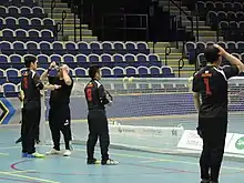 ![]() Japan defending a throw from Thailand. Regional goalball championships, Chiba, Japan (2019). | |