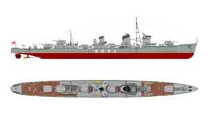 The Kagerō-class destroyers were outwardly almost identical to the preceding light cruiser-sized Asashio class, with improvements made by Japanese naval architects to improve stability and to take advantage of Japan’s lead in torpedo technology. They were designed to accompany the Japanese main striking force and in both day and night attacks against the United States Navy as it advanced across the Pacific Ocean, according to Japanese naval strategic projections.[2] Despite being one of the most powerful classes of destroyers in the world at the time of their completion, only one survived the Pacific War.[3]