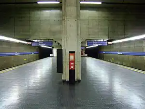 It is a buried station with an apparent concrete structure and island platform located under the distribution mezzanine. It has openings for natural lighting in the ambient of the platform and a different landscaping project, with the presence of gardens on the level of the lobby, where the tickets offices and the gates are.[2] The project of the station gave to the architect Meire Gonçalves Selli an award in the 2nd Iberoamerican Architecture and Civile Engineering Biennal of Madrid in 2000.