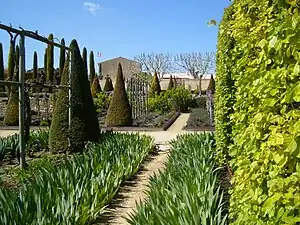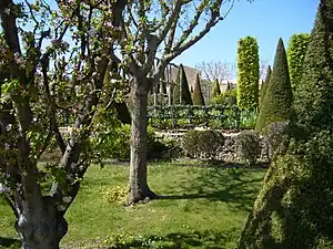 The lower terrace features fruit trees, particularly old varieties of apples and pears. The garden also has a garden of herbs, a collection of asters, and boxwood hedges trimmed in ornamental forms.