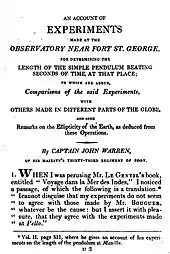 - ↑ Warren, John (1812). "An account of experiments made at the observatory near Fort St. George, for determining the length of the simple pendulum beating seconds of time at that place; to which are added comparisons of the said experiments, with others made in different parts of the globe, and some remarks on the ellipticity of the Earth, as deduced from these operations": 293–308.