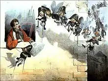 Before La Silhouette closed, Charles Philipon and Auguste Audibert founded La Caricature in 1830, with Honoré de Balzac as a literary editor and Grandville, Achille Devéria, Honoré Daumier, Edme Jean Pigal, Auguste Raffet, and Charles-Joseph Traviès de Villers as cartoonist and lithographers.[8] As one author put it "From 1830 to 1835 Philipon and La Caricature waged all-out war against Louis-Philippe."[1] As part of this "war" Grandville designed numerous prints, including multi-part lithographs published over a period of weeks that collectors could piece together into one, e.g. the seven part Grande Croisade contre la Liberté (The Great Crusade Against Liberty) and La Chasse à la Liberté (The Hunters in Pursuit of Liberty). These attacks on monarchy were taken seriously and were not without consequences. Louis Philippe's regime seized papers, levied fines, and sent editors, writes, and illustrators to prison. Daumier was fined 500 francs and spent six months in prison in 1832. Charles Philipon received even greater fines and longer prison terms as did other publishers. Grandville endured persistent harassment from the police, including searches, and one incident described as a mugging in his own building by thuggish policemen, foiled by a neighbor who confronted them with pistols. He is said to have been deeply distressed by these events. Grandville filed criminal charges asserting the police had entered his residence by force, and he later published a lithograph Oh!! Les vilaines mouches!! Philipon organized L'Association Mensuelle lithographique which offered fine prints to its members in the early 1830s. Grandville produced over half the prints, with the profits going to pay the paper's fines.[1][5]