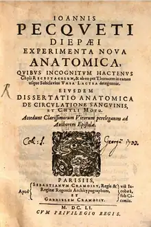 Jean Pecquet studied medicine at Montpellier, where he investigated the important discovery (in 1622, by Gaspare Aselli) of the course of the lacteal vessels, including the receptaculum chyli (or reservoir of Pecquet, as it is sometimes called) and the termination of the principal lacteal vessel, the thoracic duct, into the left subclavian vein.[1] He dissected the eye and measured its dimensions. Contrary to Edme Mariotte, he maintained that the retina, not the choroid, was the principal organ of vision.
