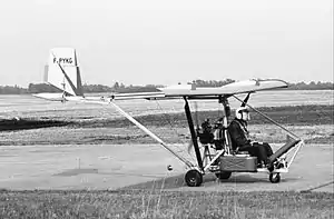 It was a minimalist, open framework design consisting of a three-wheeled chassis supporting a pilot seat and pusher engine installation, to which a rigid wing of aluminium structure and skin was attached by struts. A conventional empennage of fabric-covered aluminium construction was carried on a long boom aft of the wing, and supported with a strut to the chassis.