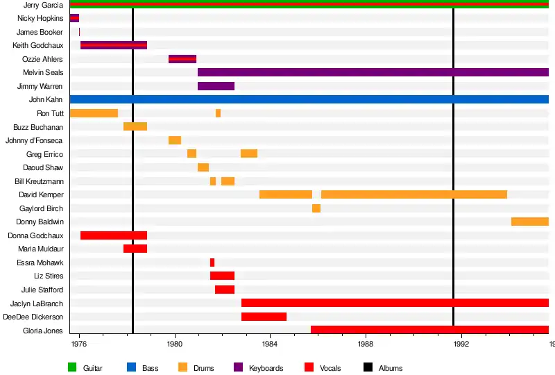 Past members | Jerry Garcia John Kahn Ron Tutt Nicky Hopkins James Booker Keith Godchaux Donna Godchaux Maria Muldaur Buzz Buchanan Ozzie Ahlers Johnny D’Fonseca Greg Errico Melvin Seals Jimmy Warren Daoud Shaw Essra Mohawk Liz Stires Bill Kreutzmann Jaclyn LaBranch DeeDee Dickerson David Kemper Gloria Jones Gaylord Birch Donny Baldwin |