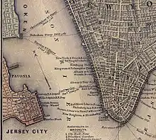 While the Communipaw ferry dated back to 1661 during the Dutch colonial period in New Amsterdam,[2] the Jersey City ferry, then called the Paulus Hook ferry, began in July 1764[3] and operated from Paulus Hook to Mesier's dock at the foot of Courtland Street (where Cortland Street Ferry Depot would later be built).[4] Almost immediately and for several decades subsequently, a complicated series of legal battles broke out over who should operate the ferry, where the crossing(s) should be located and at what rate passengers and other cargo should be charged for the journey.[5]
