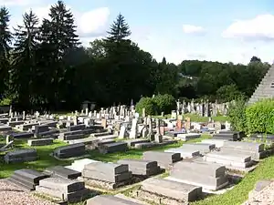 The Jewish cemetery of Besançon is located on Anne Frank street, between the Bregille and Palente areas, in the northwest part of the city. The older part of the cemetery was procured by two notaries of the Jewish community of Besançon, in 1796. In 1839 the cemetery was expanded. The earliest graves date from 1849, and the cemetery is still in use. At the entrance of the cemetery a memorial commemorates the members of the Jewish community of Besançon killed during the First World War. Today the cemetery holds between 400 and 600 graves, in an area measuring about 935 m2.[1]