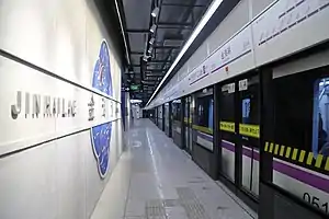 Jinhai Lake (Chinese: 金海湖; pinyin: Jīnhǎi Hú) is a station on Line 5 of the Shanghai Metro. Located at Zefeng Road and Jinhai Highway in the city's Fengxian District, the station is located on the main branch of Line 5 and opened as part of the southern extension of Line 5 on 30 December 2018.[1] It is an underground station.[2][3]