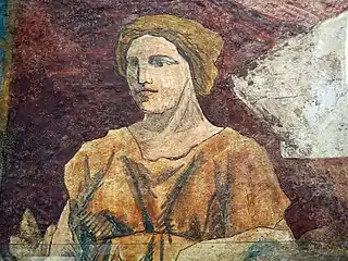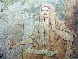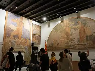 The Joaquín Torres-García Hall in the Palace of the Generalitat of Catalonia houses the frescoes painted by the artist on the walls of Salon Sant Jordi from 1912 to 1916, commissioned by President of the Council and the Commonwealth of Catalonia Enric Prat de la Riba. Torres-García worked on the first mural for 13 days, beginning on 28 July 1912, and it was unveiled on 13 September of that year.[1] The four completed frescoes are entitled La Catalunya Eterna (Catalunya Eternal), L'Etat d'Or (The Golden Age), Les Muses (The Muses) and Lo temporal no es mes que simbol (The Temporal is Nothing But a Symbol). The murals were hidden from 1926 to 1966.[4]