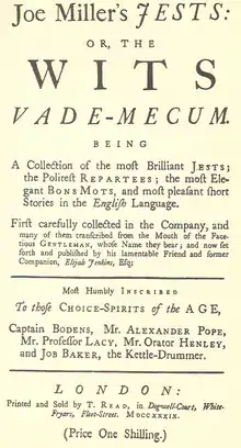 - ↑ "Joe Miller Joke Book". 26 May 2014. Retrieved 11 July 2022.
