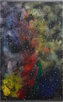 In the late 1970s, Ray's interest in the phenomenological qualities of resin led him to contemplations of the night sky, whose qualities—remote depth of color, refraction of space, dark air and white light—similarly combined science, imagination and emotional expressiveness.[1] He explored these concerns in the "Nebula Paintings," a series of celestial landscapes employing acrylics, spray paint and mixed media that he has continued to produce into the 2020s.[1][6] His earlier Nebula paintings combined colorful gestural and atmospherics with a careful use of pointed terms that reflected the context of their making; for example, the painting In Space (1980) bears ghostly text reading "race" and "complexion constellation."[1][6] Critics have described his later "Nebula" works as more vibrant and hypnotic works that "conflate the properties of post-Impressionism and actionist Ab Ex, the emotional allegory of literally nebulous abstraction, and the cosmic bent of space-travel science" (e.g., Flaming Star Nebula #1, 2017; Red Yellow Black White and Burnt Sienna, 2020).[1][6]