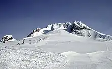 In the spring of 1845, Palmer traveled to Oregon without his family, as captain of a wagon train of 23 wagons. Stephen Meek served as the train's paid guide. Meek left the group at Fort Hall to lead some of the members on the Meek Cutoff.[7] The remaining parts of the wagon train reached the end of the overland Oregon Trail at the Columbia River, and unwilling to wait for transport down the dangerous Cascade Rapids, Palmer's party joined Sam Barlow's party in a quest for passage through the Cascade Range around the south side of Mount Hood. Palmer climbed to the 9,000-foot level of Mount Hood on October 7, 1845—with little food and the scant protection of moccasins—to scout a route off the mountains. This was Mount Hood's first recorded climb;[2][8] the Palmer Glacier on the mountain is named for him.[9]