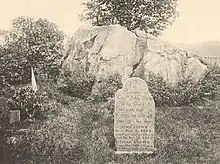In 1848, bankrupt and having lost the family's house, Brown heard of Gerrit Smith's Adirondack land grants to poor black men, in so remote a location that Brown later called it Timbuctoo, and decided to move his family there to establish a farm where he could provide guidance and assistance to the blacks who were attempting to establish farms in the area.[96] He bought from Smith land in the town of North Elba, New York (near Lake Placid), for $1 an acre ($2/ha).[97] It has a magnificent view[14] and has been called "the highest arable spot of land in the State."[98] After living with his family about two years in a small rented house, and returning for several years to Ohio, he had the current house – now a monument preserved by New York State – built for his family, viewing it as a place of refuge for them while he was away. According to youngest son Salmon, "frugality was observed from a moral standpoint, but one and all we were a well-fed, well-clad lot."[99]