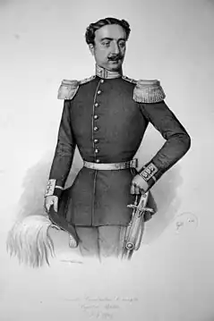 Arriving at Bucharest as the new Russian consul, Alexander Pini reputedly enjoyed a steady friendship with the Prince, much to Manuc's chagrin. The latter died unexpectedly at Hîncești on 20 June, which "must have filled with joy Prince Caradja's soul".[219] Meanwhile, the Sultan considered ending the affair with a violent coup in Bucharest. Merișescu reports being tipped off that "your prince has not paid his haraç these past five years, and the Turks are preparing to have him slashed".[220] Moreover, the Ottoman court had been made aware that Caradja was in contact with the Eteria, and that this intrigue was being facilitated by Russian diplomats in Wallachia.[221] At some point in 1818, Caradja and Callimachi's delegates met with Emperor Alexander and his ministers in Kishinev, urging them to invade the Principalities. Kapodistrias told them off, since "Russia's desire is to conserve peace with the Porte, at any cost".[222] Caradja himself caught up with rumors that he had been disgraced at the Ottoman court; he also discovered that his Soutzos son-in-law, who wanted the throne of Moldavia, now supported the toppling of both Princes. In retaliation, he sacked and humiliated Michael's father, Gregory Soutzos, from his postings at the Bucharest court.[223] On 28 September 1818 (New Style: 10 October), he convened the Princely Divan and asked them to form a regency council while he absented Bucharest "for reasons he did not care to disclose to them."[224]