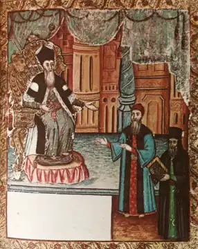 Caradja also welcomed in his palace Joseph Ledoulx, the French Empire's envoy to Wallachia, who recalled that Caradja made sure to avoid relevant diplomatic subjects, instead of focusing on showing his court as both splendid and peaceful—"he proved to me that the role of king [sic], which he had only been playing for two months, was neither hard nor unpleasant."[59] Ledoulx reports that the court included boyars, slave girls, as well as "all sorts of nobodies" who lived exclusively on princely handouts.[60] The court's reliance on princely boons and titles was also commented on by Caradja's Swiss secretary, François Recordon, who was puzzled by its sartorial components. According to Recordon, Wallachian boyars would spend lavish amounts on clothes and jewelry, including kalpak headgear that he measures as "at least five feet across".[61] As one of his first acts in power, Caradja called on his friend Fleischhackl, who was serving as Austrian consul in Bucharest, to help him import 100 pounds of snuff, which he then sent as a thank-you bribe to Sultan Mahmud. When Fleischhackl had his first audience with the Prince, he found himself pestered by the latter's retinue, and only stopped them from following him by paying them bribes totaling 387 piasters.[62]