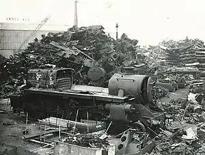Thousands of vehicles were sent for scrapping with no chance of being rescued for preservation. Their fates were sealed the moment they arrived.[6][7] However, a few were able to escape scrapping for preservation; GWR 6400 Class No. 6430, which is now owned by the Dartmouth Steam Railway, being one of the most famous examples.[8][9] BR Standard Class 8 No. 71000 Duke of Gloucester, which was the only member of its class built and was eventually preserved years later, was towed to this area in 1967 and due to be scrapped here. However, a man named Maurice Sheppard, who was a former fireman for British Railways, realized that this locomotive was delivered to the wrong scrapyard. It was supposed to go to Woodham Brothers in South Wales instead. In October 1967, No. 71000 was moved out of Cashmore's and into Barry Scrapyard where it was exposed to the elements until it was rescued in 1974.[10][11][12] BR Standard Class 4 4-6-0 No. 75014 was also sent to Cashmore's scrapyard along with No. 71000 Duke of Gloucester before being sent to Barry, No. 75014 remained at Barry scrapyard until 1981.[13]