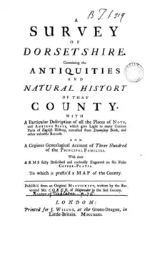 Coker was long believed to be the author of A Survey of Dorsetshire … to which is Prefix'd a Map of the County (1732), a systematic description of the history, topography, and genealogy of the county, published sometime after the author's death.[2] This was revealed to be a misattribution by county historian Rodney Legg, in an afterword to the 1980 facsimile edition of the work. The survey was, in fact, composed by Thomas Gerard (1592–1634) in the 1620s and passed onto the Coker family upon his death. Nearly a century later a London bookseller, John Wilcox, proceeded to publish it under John Coker's name.[1][3]