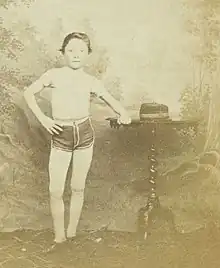 At age eight, Day was touted as Australian champion pedestrian, having beaten all comers in the colony. By November 1864 he was touring with the "Australian Troupe" variety artistes, demonstrating speed walking.[1] In 1865 he was taken to England aboard Royal Standard to compete against some of the leading pedestrian athletes of the day.[2] Such races were popular subjects for gambling, and he was nine years old, 3 feet 10 inches (117 cm) high, and weighed 54 pounds (24 kg),[3] In 1867, he completed 300 laps of a circuit created in the Royal Victoria Theatre, Sydney, a total of 5 miles (8.0 km), in under 50 minutes[4] It is not known whether this exhibition was provided for gambling purposes, but it was said that his backers did not receive the profits they expected from exhibiting him.[5] Another challenge, to walk seven miles within the hour, was staged at the track attached to Goyder's Red House hotel in Northcote. It started at £30 to £10, and Day was loudly supported each time he passed the judge's stand, but when it was clear he had no prospect of succeeding, one sympathizer invaded the track and carried him away.[6]