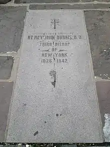 Dubois is buried under the sidewalk at the entrance to the Old St Patrick's Cathedral on Mott Street, which he requested, so that people could "walk on me in death, as they wished to in life".[6] A plaque at the church's entrance memorializes the early bishop.