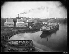 The Gore Bay refinery was used for the production of lubricants.[112] In 1921, the company acquired land adjacent to the refinery and erected a four-storey brick reinforced concrete building, with brick curtain walls, for use as a bulk store for its products.[113] In 1923, with Fell's operations shifting from shale oil to imported crude oil, he planned to also use the Gore Bay site as a tanker berth and to store imported crude oil. Despite local opposition he succeeded in erecting storage tanks there.[114][115][116]