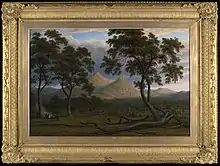 Natives on the Ouse River, Van Diemen’s Land (1838)[18] depicts aboriginal people in the landscape but was painted after the genocide of aboriginal Tasmanians. One critic argued the painting is "informed by European notions of an Antipodean Arcadia, with Indigenous people living in a landscape unsullied by European contact"[7][18] but Glover had experience of aboriginal Tasmanian people elsewhere. John Glover's last major work was painted on his 79th birthday.