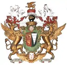 Heraldic achievement of John Granville, 1st Earl of Bath (1628–1701), south wall of Granville Chapel, Church of St James the Great, Kilkhampton, Cornwall. The arms are Gules, three clarions or (Grenville) impaling Azure, a pile ermine (Wyche). The Latin motto on a scroll beneath is Futurum invisibile ("The future is unseen").