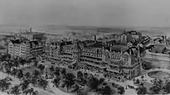 Ellen G. White, who had proclaimed that a cleansing sword of fire was poised over the increasingly "worldly" and business-oriented Battle Creek, was against rebuilding the large institution.[29][30] Although she apparently wrote a manuscript testifying against the rebuilding in 1902, it was not sent to Kellogg at that time,[29] and Kellogg did not directly consult her about his plans.[23]: 38 With support of the board of directors, he not only rebuilt the institution, but doubled its size. The new building was designed by architect Frank Mills Andrews of Ohio[31] and opened on May 31, 1903.[15]: xiii–xv [26]: 189 Designed to be fireproof, the new brick building was six stories high, with an elegant frontage extending 550 feet along Washington Avenue, and three wings opening out behind. It included, among other things, a solarium and palm court, and it cost more than $700,000.[32]