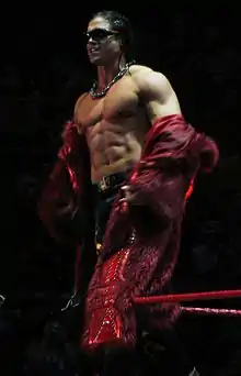 Alongside his team MNM, Hennigan debuted on WWE television as Johnny Nitro, presenting himself as an arrogant wrestler with "elite Hollywood status".[271] After winning the ECW World Championship in 2007, he changed his ring name to John Morrison and his gimmick was tweaked to be even more conceited and self-aggrandizing[272] — in addition to being modeled after Jim Morrison, the legendary frontman of the 1960s rock band The Doors, to whom he bears a strong physical resemblance.[65] Following his return to WWE and reunion with his tag team partner the Miz in 2020, Hennigan added a comedic aspect to his villainous character, with WWE describing him as using "quirkiness and quick wit to shine every time he is on screen".[16] He also began to refer to himself as "Johnny Drip Drip", a reference to the song "Drip" by rapper Cardi B.[236]