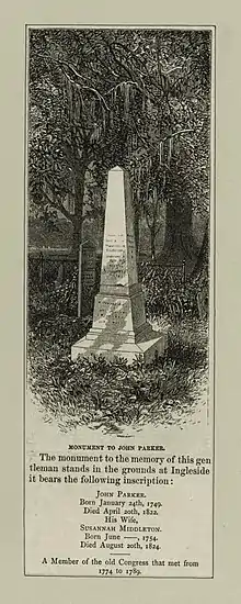 John Parker was buried on the Hayes Estate, later known as the Ingleside Estate, in St. James' Parish, Goose Creek, near Charleston. In 1952 his monument was moved to cemetery at St. James Church, Goose Creek, for preservation.