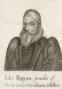 His parents were John Rogers (died 1601), a shoemaker from Moulsham in Essex, and his wife, Mary (died 1579). Richard Rogers, his uncle, provided for his education at Emmanuel College, Cambridge. On two separate occasions John Rogers sold his books as he was "so addicted to vice", if not for the persuasion of Richard Rogers wife, John Rogers may have been cast off totally. Despite his early mistakes John Rogers became "an illustrious ornament" to his college and was of the most "exemplary piety".[2] It appears he graduated in 1591/2.[3] In 1592 he became vicar of Honingham, Norfolk, and in 1603 he succeeded Lawrence Fairclough, father of Samuel Fairclough, as vicar of Haverhill, Suffolk.[4]