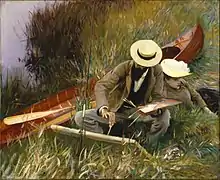 Sargent's friends and supporters included Henry James, Isabella Stewart Gardner (who commissioned and purchased works from Sargent and sought his advice on other acquisitions),[102] Edward VII,[103] and Paul César Helleu. His associations also included Prince Edmond de Polignac and Count Robert de Montesquiou. Other artists Sargent associated with were Dennis Miller Bunker, James Carroll Beckwith, Edwin Austin Abbey, and John Elliott (who also worked on the Boston Public Library murals), Francis David Millet, Joaquín Sorolla, and Claude Monet, whom Sargent painted. Between 1905 and 1914, Sargent's frequent traveling companions were the married artist couple Wilfrid de Glehn and Jane Emmet de Glehn. The trio would often spend summers in France, Spain, or Italy, and all three would depict one another in their paintings during their travels.[104]