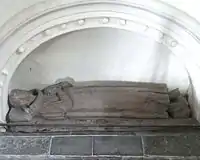 He died at Stowford and was buried in the Stowford Chapel in the north transept of West Down Church, where survives his much-worn[10] life-size effigy carved in oak, dressed in his robes of office,[11] set on the floor under a low recessed arch set into the north wall.[12] The colouring of the effigy was renewed in 1873,[13] but no trace survives today.
