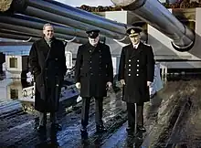 Tovey's best known achievement in this period was orchestrating the pursuit and destruction of the Bismarck. He had insisted on being a "sea-going" admiral, despite pressure from above and the disadvantages of being away from command centres. He believed that this was one element in maintaining morale in the fleet, by sharing the privations and dangers of his men. The final action against the Bismarck added further weight to his decision. When the two British battleships HMS Rodney and King George V located Bismarck, they had the setting sun silhouetting them while Bismarck remained in the evening gloom. Tovey observed this and, to the surprise of his staff, ordered that the final action be delayed until the following morning. In so doing, he ensured that the benefits of the light would be reversed to the British advantage and that the German crews would be fatigued by constant harassment by Vian's destroyers. The risk was that Bismarck would, somehow, escape but Tovey accepted this.[1] Tovey was made a KBE "... for distinguished services in the masterly and determined action in which the German Battleship Bismarck was destroyed."[21]