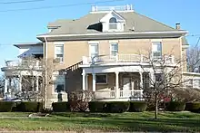 The John W. Lewis House is a historic house located at 503 Chestnut St. in Marshall, Illinois. The house was built between 1906 and 1908 for John W. Lewis, a politician and early settler of Clark County. Architects Barber & Kluttz designed the 2+1⁄2-story Classical Revival house. A white two-story verandah marks the front entrance of the house. Two-story Ionic columns support the verandah around the entrance; to either side, the verandah ends at a large circular section supported by one-story columns. A smaller two-story verandah with a similar design surrounds the side entrance. The house's hipped roof features three dormers and cresting along its peak.[2]