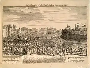 In 1745 Sir John joined the rebellion of Charles Edward Stuart against the Hanoverian crown,[4] serving as a colonel in the Jacobite army before being captured at the Battle of Culloden and hauled off to London to face trial and execution.[4] He was indicted for treason at St Margaret's Hill, Southwark on 4 November 1746, and was found guilty, despite arguing in his defence that he had not personally taken up arms against the Crown, and was executed at Kennington Common on 28 November 1746.[3]