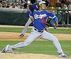 His contract was purchased and he was called up to the Dodgers on June 29, 2013.[4] He made his debut in relief on June 30 against the Philadelphia Phillies and retired the 3 batters he faced. He appeared in 9 games, with a 2.16 ERA before he was shut down with a quad strain.[5] In 2014, he again spent most of the season with the Isotopes, where he was in 31 games and had a 3.24 ERA with 10 saves. In 5 games with the Dodgers, he allowed 8 runs in 6.1 innings for an 11.37 ERA. He was not called up in September because he was dealing with an arm injury he suffered in the minor leagues.