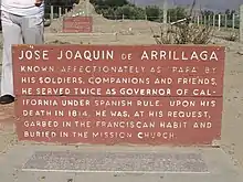 On July 25th, 1813, José Joaquín de Arrillaga died at Mission Nuestra Señora de la Soledad and was buried there.[8] He is said to have been the only Spanish governor to be buried in California and on US soil,[8] but this must be a mistake, because the Spanish Governor before him, José Antonio Roméu, was buried at Carmel Mission in 1792. José Joaquín de Arrillaga's grave is at 36°24′17″N 121°21′19″W / 36.40472°N 121.35528°W.[9] The sign there has the inscription: "Known affectionately as "Papa" by his soldiers, companions and friends, he served twice as governor of California under Spanish rule. Upon his death in 1814 he was, at his request, garbed in the Franciscan habit and buried in the mission church." He was called "papa," because he worked hard to improve the lives of his men.