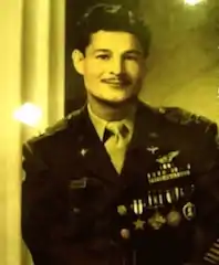 The B-17 plane that he was in was shot down by the Japanese on June 26, 1943, over New Britain, an island in the South Pacific,[3] after they had taken out a Japanese airfield in Rabaul.[2] Of the ten fliers on the plane, he was the only man to survive.[3] He fell out of an open door of the burning plane after it was hit, the pilot and copilot were killed, and the plane went into a dive.[4] He was wearing a parachute and landed as the plane exploded upon crashing into the jungle. With a broken back and having been shot in his leg and jaw, he crawled to the plane's wreckage through the jungle and saw the dead bodies of his fellow crewmen.[3][4] He made a promise at that time, "The only thing I could do was to tell the (dead) men, in my silent way, that I couldn't take them with me but I would be back to take care of them."[3] After about a month in the jungle, he was found by islanders. In bad shape, he was handed over to the Japanese and held in the Rabaul prisoner of war camp on New Britain[4] for two years.[2] Of 64 people held at the camp, he was one of seven to live through the experience.[3] When he returned from the war, he and his wife visited the families of the members of his crew and was often the first to let them know that the soldiers had died.[2]