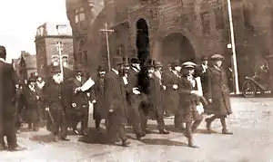 A march in support of the Balfour Declaration in 1917, in front of the parliament building in Toronto, Canada. The man in the shiny black top hat is Rabbi Joseph Weinreb, the chief rabbi of Toronto at the time.