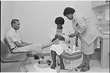 The PA Program had been made up strictly of men, especially those with former experience as Navy corpsmen, was reluctant to enroll Nichols.[3][2] However, she was encouraged to apply by Doctor Eugene Stead, the creator of the PA training program.[1] Nichols was accepted and fought to be given the same stipend as the men in the program.[1] During her training, she still worked in the cardiac unit to support her family.[1] She and her family also lost their house due to a fire in 1969 and the faculty and students at the PA school helped to raise money to help Nichols' family.[3] Nichols graduated from the program in 1970, becoming the first woman to earn a degree as a PA.[3]