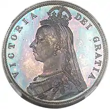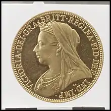 A competition was held, and several invited sculptors were asked to submit two versions of a proposed new obverse for the coinage by 31 October. An obverse design by Sir Thomas Brock depicting Victoria wearing a diadem and a veil was chosen for the obverse. The committee decided to retain Pistrucci's George and Dragon design on the coins it appeared upon, as well as expanding it to the half sovereign. Reverse designs, some by Brock and some by Poynter, were determined upon for the other coins of sixpence and above, and the committee recommended the value appear on all coins from the threepence to the half crown.[59] A royal proclamation for the new coins was promulgated on 30 January 1893, and the new coins met a favourable reaction.[60] Some 1893 sovereigns were struck with Boehm's design at the Australian branch mints,[61] and half sovereigns of that type were minted both at London and in Australia.[62] Of the silver coinage, some 1893 sixpences and threepence with Boehm's obverse were struck at London,[63] but otherwise, the Jubilee coinage was at an end.[10][64]